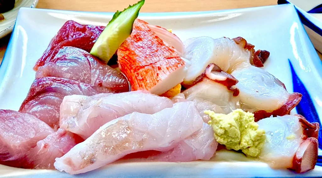 先ずはこれを飲み、肴としての刺身に、白身魚の唐揚げや寿司をいただいた。青森らしく、刺身にマグロ、ホタテ、イカは漏れなく入っており、それがまた美味しいのだ。